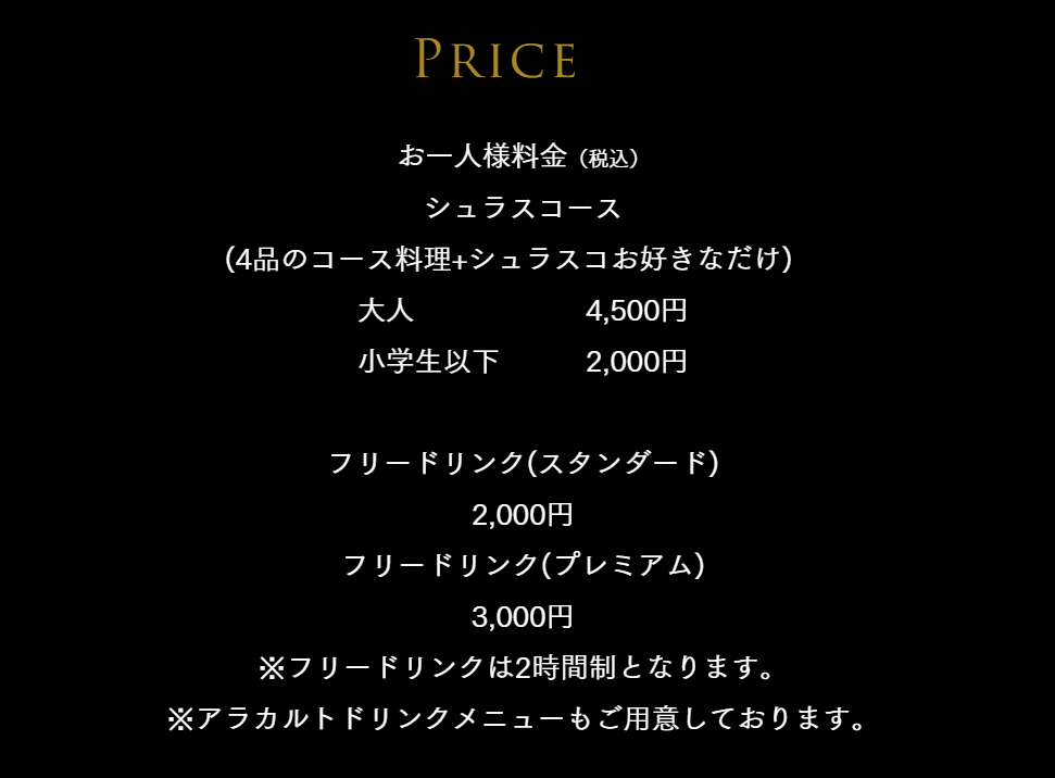 シェラスコのコース料理は前菜からメイン、デザートまであります。料金は大人5000円、小学生以下は2500円です